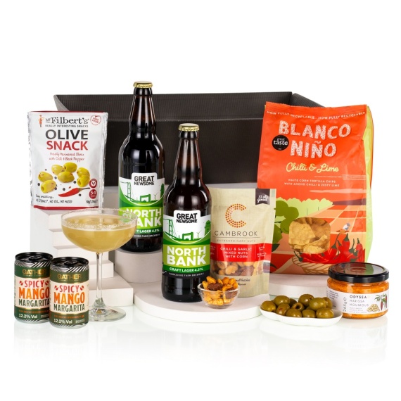 Add a little heat with our A Little Bit of Spice hamper, a bold mix of savoury snacks and spicy treats including Chilli & Garlic Nuts, Harissa Houmous, Chilli & Lime Tortilla Chips, Mango Margarita and North Bank Lager. Perfect for spice lovers. This hamper contains 6 items: Blanco Nino Chilli & Lime Tortilla Chips 170g Cambrook Extraordinary Chilli & Garlic Mixed Nuts with Corn 65g Mr Filbert’s Chili & Black Pepper Olives 50g Odysea Harissa Houmous 265g Gather Spicy Mango Margarita 150ml 12.2% vol x 2 Great Newsome North Bank Lager 500ml 4.5% vol x 2 Packed in black kraft tray.