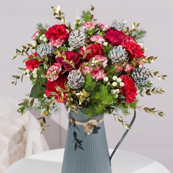 Embrace the Christmas spirit with this delightful festive bouquet featuring vibrant red Carnations paired with show-stopping red Roses. This bouquet is enhanced with charming white Minuetta Spray Carnations, seasonal Hypericum berries and enchanting dusted Pine Cones that add a touch of winter woodland magic.